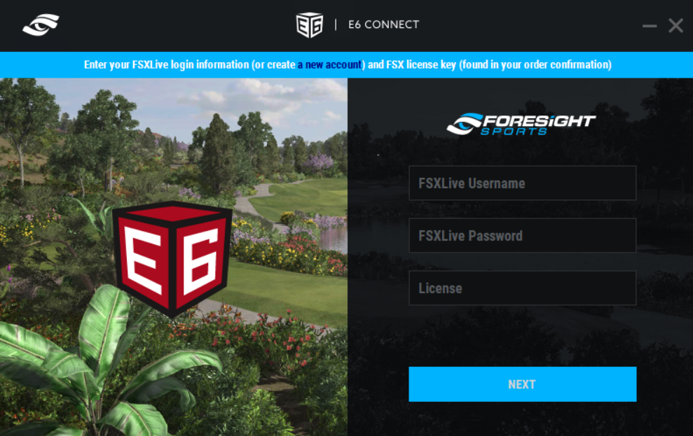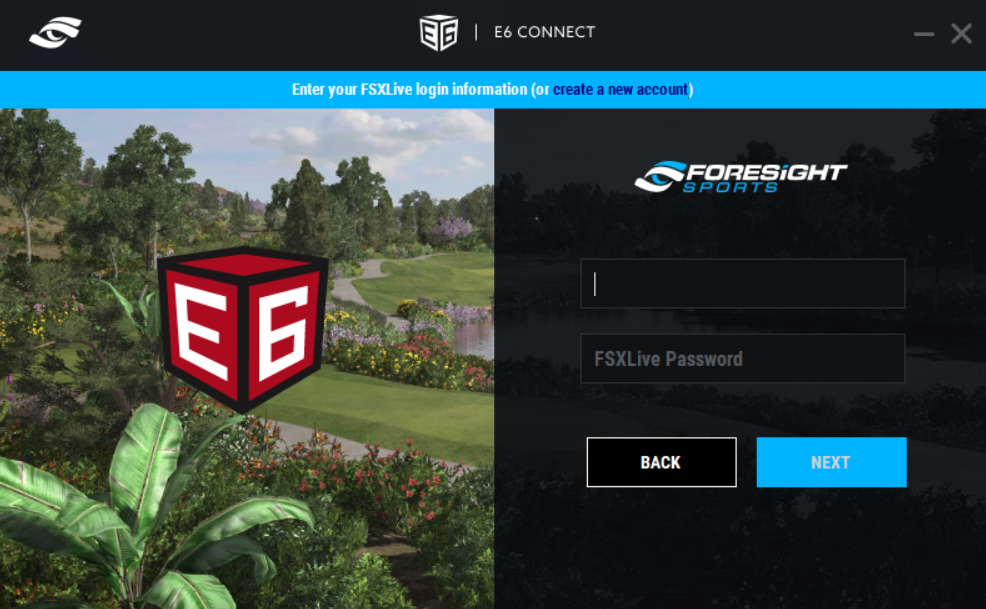 7. At the next screen, enter your FSX Live login details along with your Foresight Sports E6 activation code. Your E6 activation code will be emailed to you by our technical support team support@foresightsports.com. More information is found under the downloads heading in section 01.